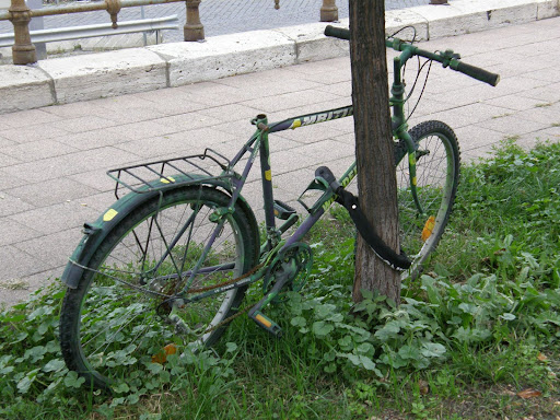 Nem értem ezeket, nem értem ezeket. Reklámnak céltalan, de akkor miért tárolják a matricás roncsukat az újlipóti bicikliút mellett? Már két alkalommal is írtam a mostanság trendin LMP-s biciklibolt-tulajoknak, hogy a köztéri szemetelés már kiment a divatból, de csak morcos anyázás érkezett, bringaroncs meg maradt. Lassan benövi a fű, lassan elhordják az alkatrészgyűjtő csövik. Ha nem utálnám az illetékeseket, bizisten feljelenteném őket, amolyan precedensértékű ügy lehetne: a parkolás és a sunyi köztéri reklám közötti homályzóna.