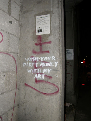 "Wash your dirty money with my art". Ez a festékszóróval és stencillel készült felirat jelent meg a VAM Design épületén, amely a szélesebb közönség számára a felboncolt kínai hullákat bemutató Bodies kiállításról ismerhető.