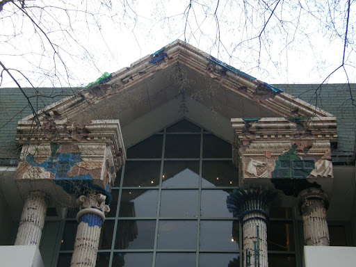 ionizált oszlopfőkkel, posztnukleáris, megolvadt rommező darabjai újra összeragasztva. Lebegő portikusszal, építészeti idézettel, alulról nyitott timpanonnal. Rusnya tetőtér,