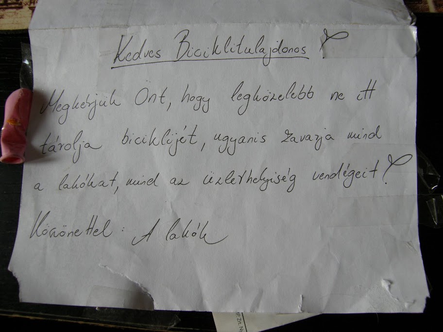 Levelezek az MSZP-vel, hallod baszom, sohasem gondoltam volna, hogy ez előfordulhat, elégé egyoldalú kommunikáció, ők írtak és szerintem nem várnak választ, szóval néhányszor lekötöztem a bringámat a villámhárítójukhoz, paranoid komcsi banda, tehát működnek azok a kameráik, nem lopják el a rászorulók a biciklim, gondoltam én, szép bicikli, teleragasztva nagymagyarországos matricával, 2004 decemberében nagymagyarországos lettem, elég volt Gyurcsány uszítását meghallgatni a határon túli magyarok ellen, közben nyomta a fasisztázást is, ártani nem árthat, gondolta, nyomta a frászt a panelprolikba, Gyurcsi szerint külföldre szakadt magyarok ellen uszítani kóser, ráadásul bevetette a Baloldal Mindent Vivő SzuperFegyverét, a fasisztázást, a ripacs a Fő Zsidóvédőt alakította, aki megállítja a hejhitlerező rohamosztagosakat, sikerült is jól felhergelnie a fél országot, szorgos szájmenésének köszönhetően a tolvaj és az antifasiszta egymás szinónimája lett, már a számtechblogok kommentelői is zsidóznak, a zsidók meg maguk alá paráznak, kösz, Gyurcsi, te aljas faszarc, remélem, hogy sokáig fogsz élni, lehetőleg a sitten, ahol az összes zárkatárs szerelmes lesz beléd, szóval a MSZP székháznál tároltam a bringám, hogy valami hasznom is legyen ezekből a tolvaj parazitákból, kár, hogy nincsen bringatárolójuk, csak a hatalmas luxusautók terpeszkednek a székházuk előtt, bár némelyik zsírosparaszt elvtárs már próbál alkalmazkodni a XXI. századhoz, mond valami zöldes-taknyos blablát a fenntartható fejlődésről, közben fingjuk sincs, mire gondolt a szövegíró, szóval nagymagyarországos bringa az MSZP székházához láncolva, oszt harmadik napig bírták a büdösök, levél várt a csomagtartómhoz celluxozva, tessék: