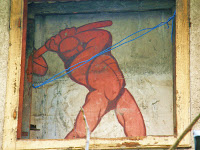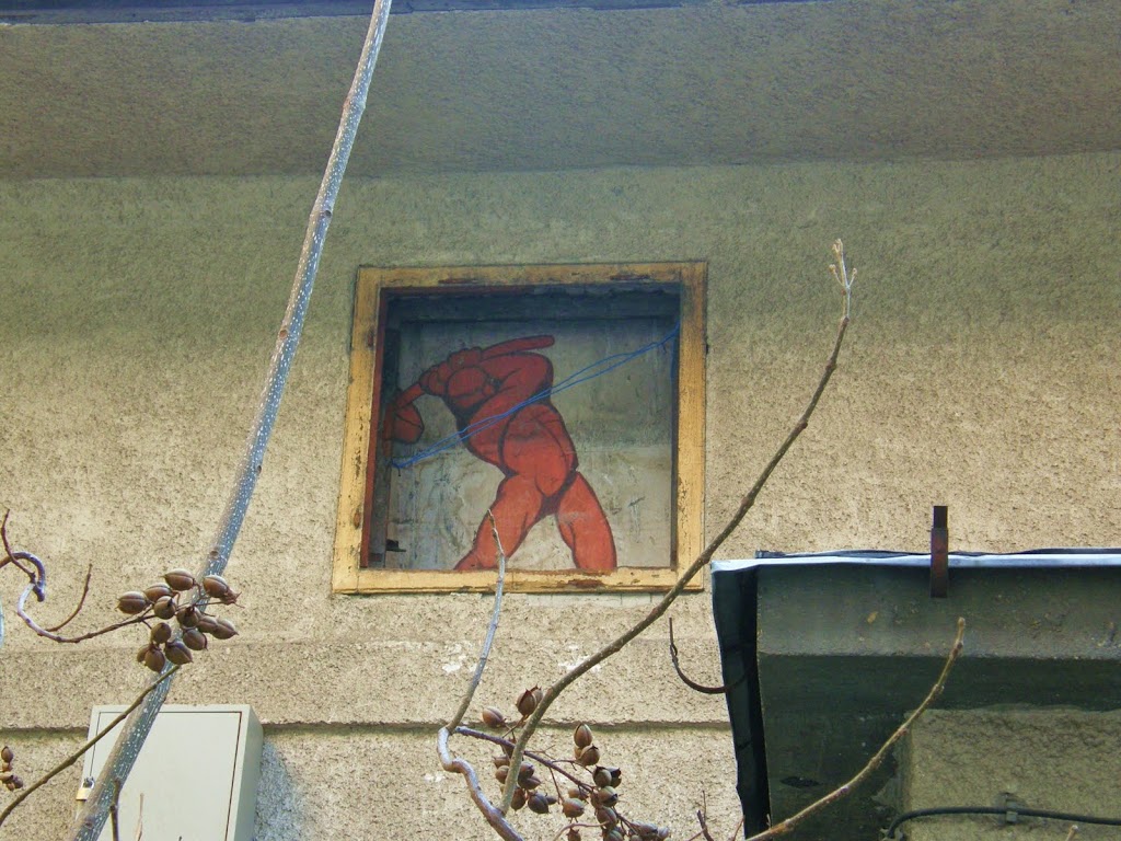 Budapest rejtett szépségei, érdemes besomfordálni a nyitva felejtett kapukon. A kalapácsos vörös ember most nyílászáróként szolgál.