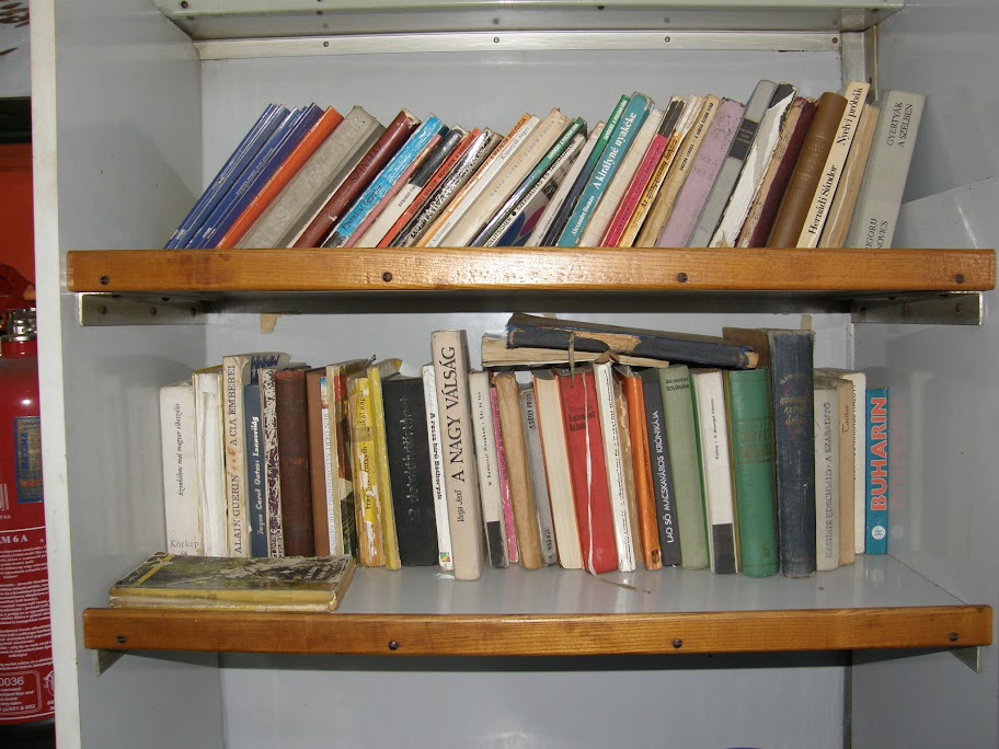 A könyvtár szegényes, ezúton kérjük meg a kedves hallgatóinkat, hogy hozzák ide megunt könyveiket. Egy részét természetesen privatizálják egyes bentlakók, de tapasztalataink azt mutatják, hogy valóban olvasnak a errefelé. Légyszilégyszi, lehetőleg ne Buharint hozzanak (nagyobb felbontásért kattintson a képre).