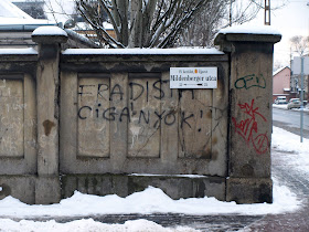 | "Cigány uralmat Újpesten" Aláírás: Fekete Kéz. lelőhely: a Baross út és a Mildenberger utca sarka |